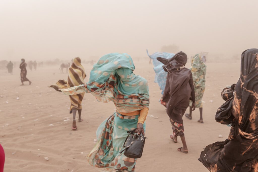 Las mujeres se cubren con chales mientras una tormenta de arena azota el campamento de refugiados de Adrè. Sin un saneamiento adecuado y con la defecación al aire libre como práctica común, el viento levanta y esparce los desechos por todo el campamento. ©Nicolò Filippo Rosso